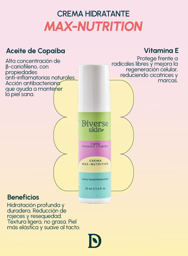 Una crema reparadora que combina la potencia antioxidante de la Vitamina E con la acción regeneradora del Aceite de Copaiba.